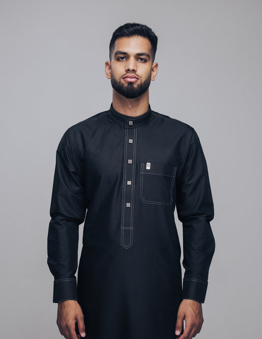 Unveil a new standard of modern elegance with the Amaani Stark Designer Thobe, a bold...