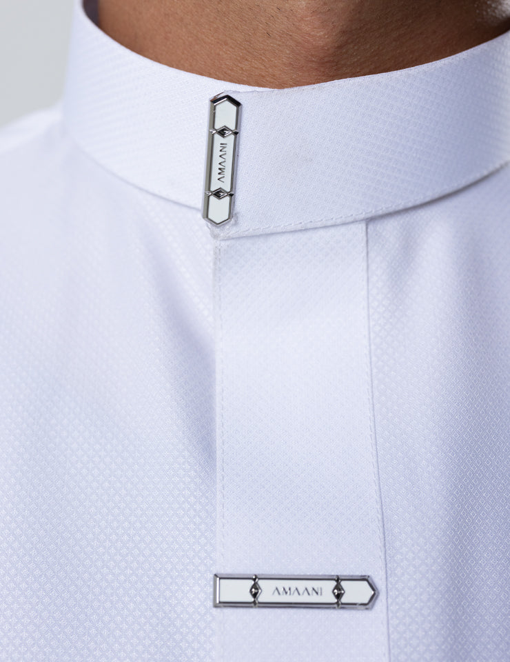 The traditional Saudi collar and tailored cuffs reinforce its classic foundation, offering a sharp and composed finish. Signature Amaani buttons are placed across the collar, placket, cuffs and upper chest pocket, creating a cohesive design language that reflects precision and craftsmanship.