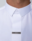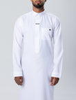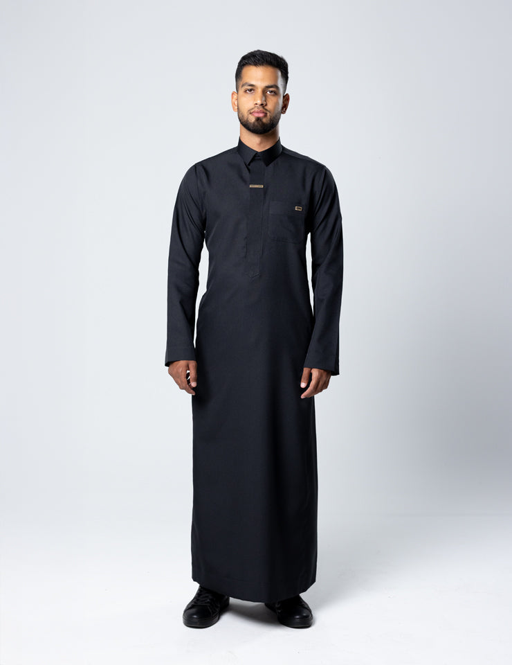 A concealed hidden zip ensures ease of wear while maintaining a seamless front profile. The absence of cuffs allows the fabric to fall cleanly, reinforcing the thobe’s sharp and assertive character.