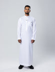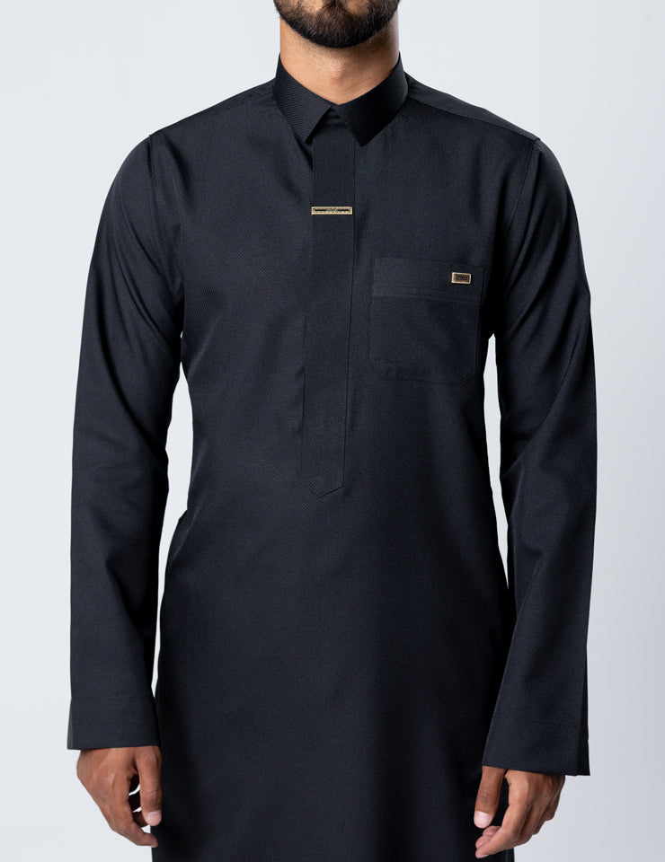 Designed in a distinctive diamond weave fabric, this Saudi thobe features a firmer composition that maintains a sharp, structured silhouette. The defined texture enhances its architectural presence while preserving a clean and polished finish.