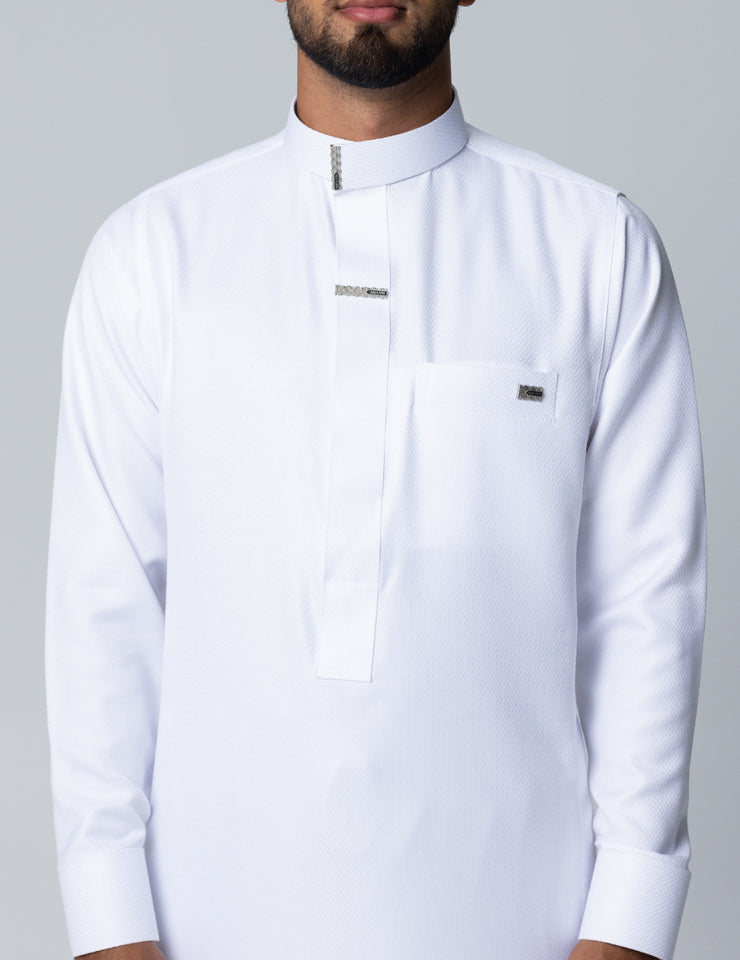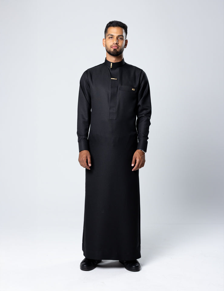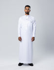 A concealed hidden zip ensures effortless wear while maintaining the traditional Saudi thobe profile. Tailored cuffs provide a sharp, structured finish suitable for elevated occasions.