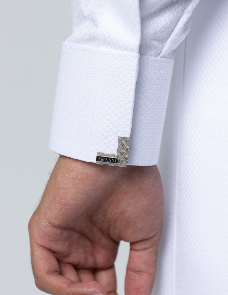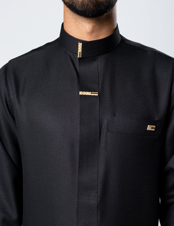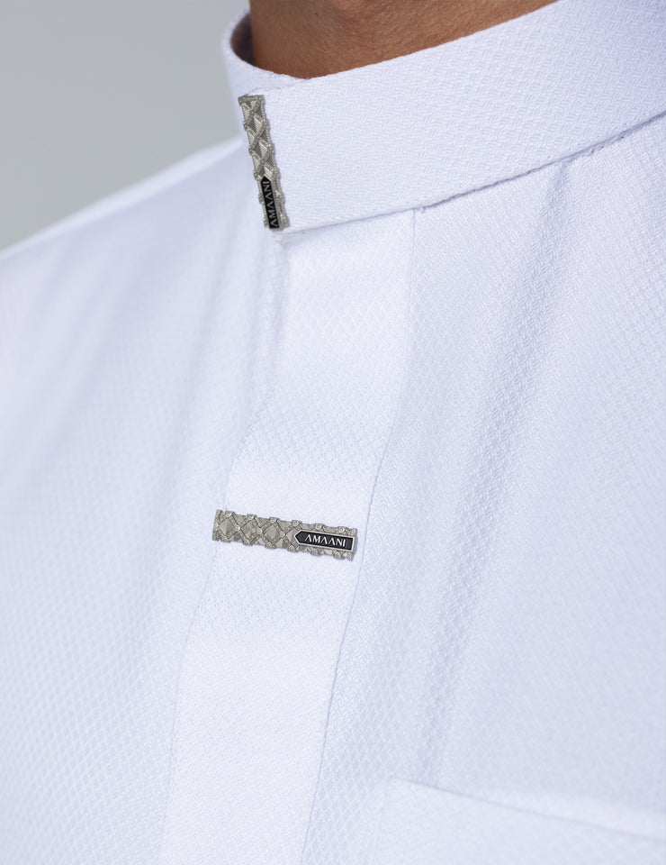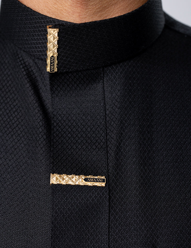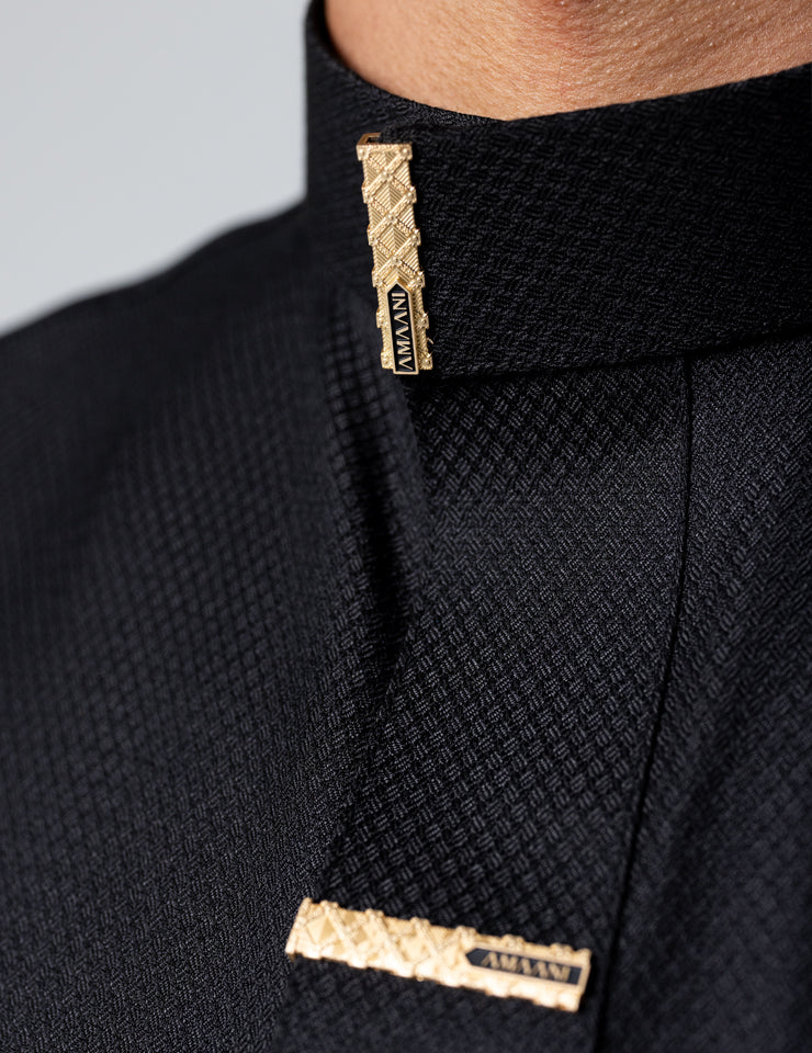 The structured Saudi collar is finished with Amaani Signature Buttons, precisely placed on the collar, cuffs, placket and upper chest pocket. Each button is custom designed to complement the garment, adding a refined luxury accent without overpowering its clean form.