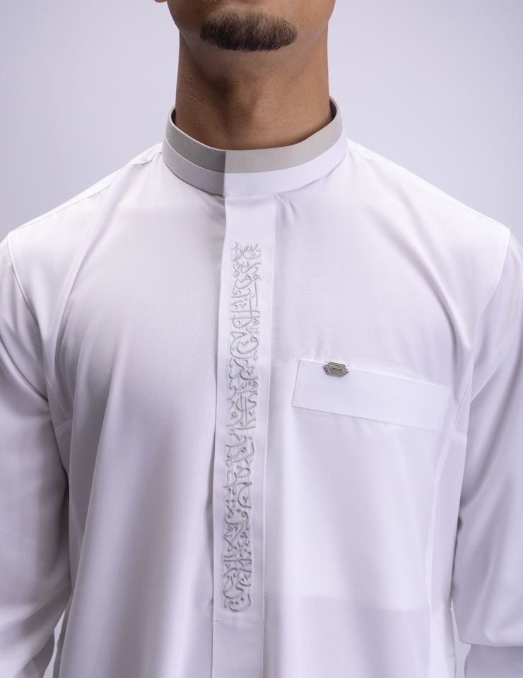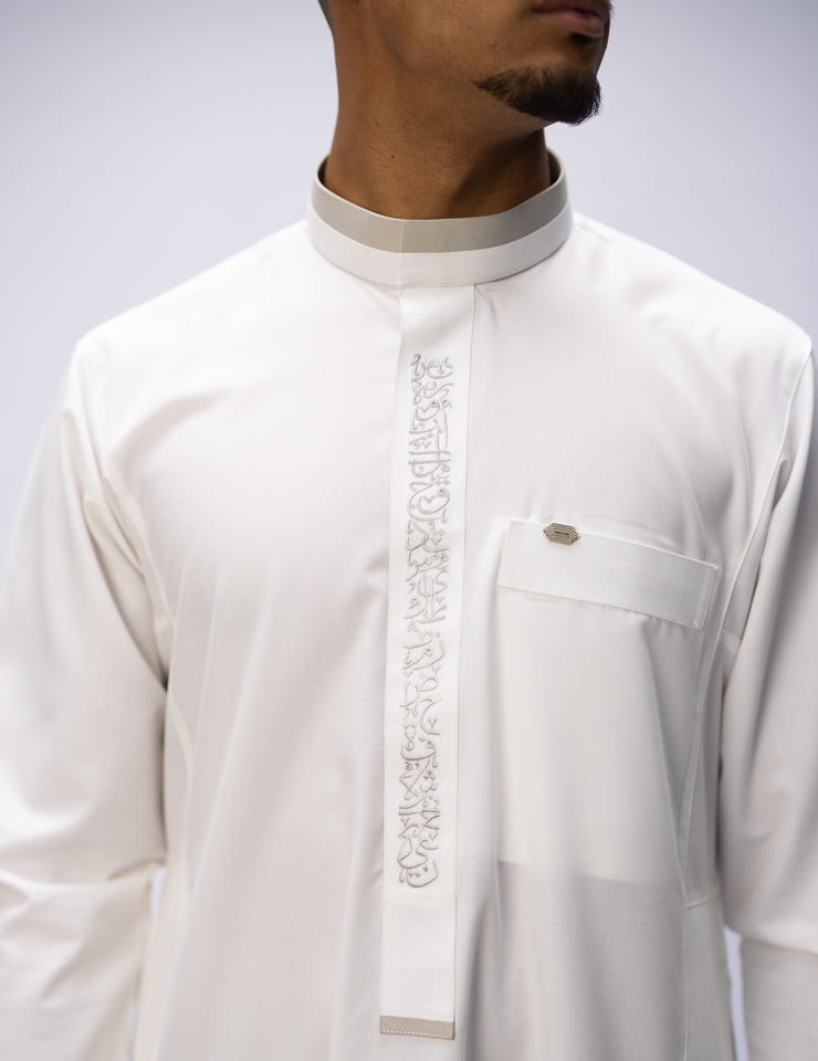 - Arabic Script Detailing - Sophisticated embroidered artistry on the placket