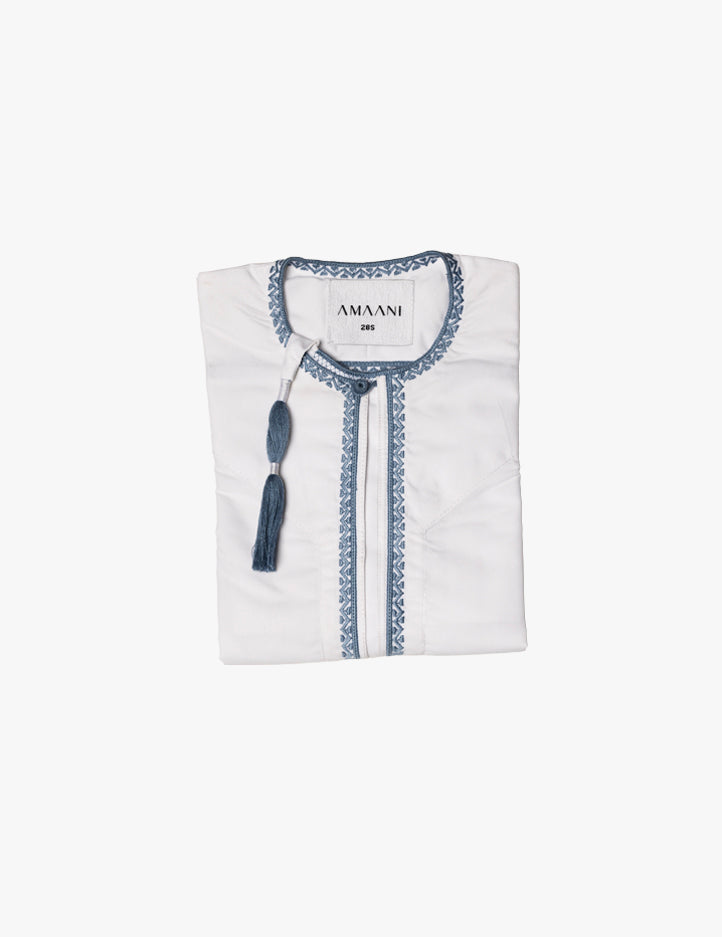 The Amaani Topaz Omani Kids style thobe is an embodiment of class and style. As the name suggests, the elegant Desert Coral contrast on the placket against the base fabric makes this design one-of-a-kind.