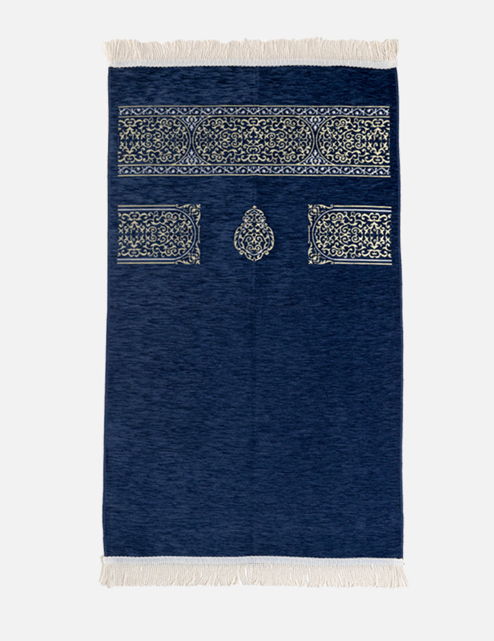 This prayer mat combines the spirituality and beauty of the architecture of Makkah Al Mukaramah.The design of this prayer mat is meant to resemble the beauty of the Kaaba Kiswa.